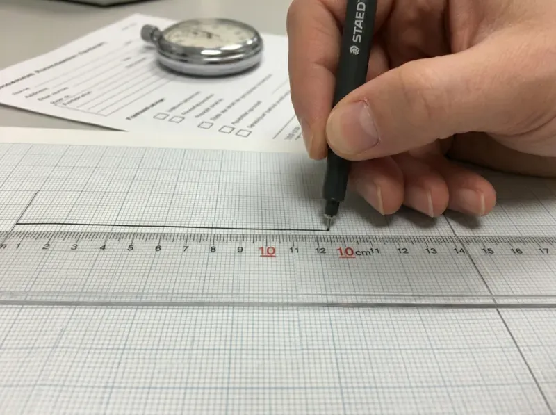 Participants estimate a 10-centimeter line segment without visual aids, testing proprioceptive spatial accuracy across all phases. The Subjective Minute Test is administered in parallel, scoring perceived time duration to assess anxiety and calm states. Together, these measures capture shifts in internal spatial and temporal processing.