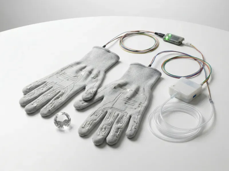 Electroencephalography (EEG) and galvanic skin response (GSR) are recorded via custom-designed sensor gloves integrated with the Inspira-X respiratory biofeedback device. This combined setup enables real-time monitoring of neural and autonomic activity during crystal exposure. The underlying technology is protected by patents KZ 2025/1095.1 and KZ 2025/0914.1.